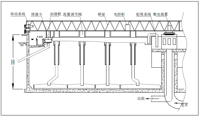 ZBX型周边传动吸泥机主要由稳流筒、集电装置、中心支座、工作桥(主梁)、吸泥结构、排渣机构、驱动装置、虹吸系统、集泥罐、行走装置和电控箱等部分组成。